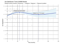 PURPOSE This study examines changes in sport-team employees’ job satisfaction over their tenure and how these are moderated by their organizational identification and team identification, formed through their concurrent roles as fan and employee. METHODS A total of 292 sport-team employees participated in a survey, and their self-reported tenure length served as the time variable. This study estimated the nonlinear pattern of job satisfaction and tested the moderating effects of dual identification using generalized additive mixed models with random effects at the individual level. RESULTS Job satisfaction followed a honeymoon–hangover–rebound curve, rising during the first 0–29.4 months, declining between 29.4 and 76.8 months, and increasing again after 76.8 months. Higher levels of organizational and team identification positively moderated this pattern. CONCLUSIONS Applying a time-based job satisfaction model from organizational behavior to the sport management setting extends the model’s generalizability. This study empirically demonstrated that the fan–employee dual identification can significantly amplify or attenuate the job satisfaction pattern, highlighting the need for sport organizations to develop human resource strategies specific to one’s tenure phase.